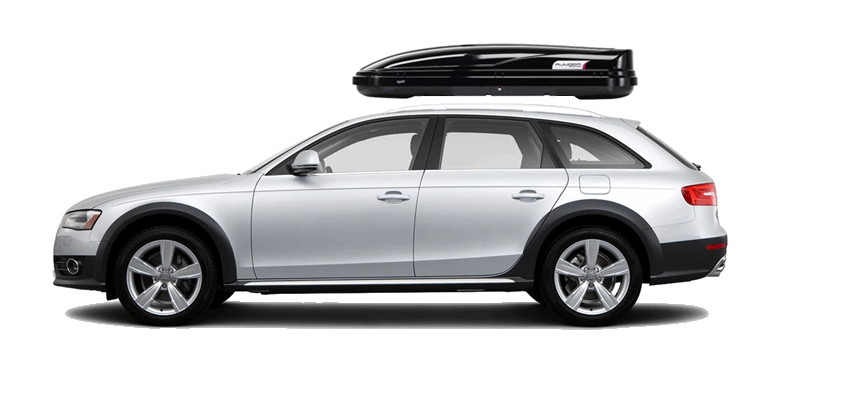 Thule Sonic XL 635S on Audi Allroad Patented AeroNose Design cuts through the air and reduces drag and noise | Patented Rear-Angled Base and expanded vehicle mounting points help maximize trunk and hatch clearance | AcuTight Mounting "clicks" when you reach optimal hold to ensure your box is secured to the rack | Oversized SecureLock ensures the box is closed securely and properly prior to driving | Dual-Side Opening for loading/unloading from either side of the vehicle