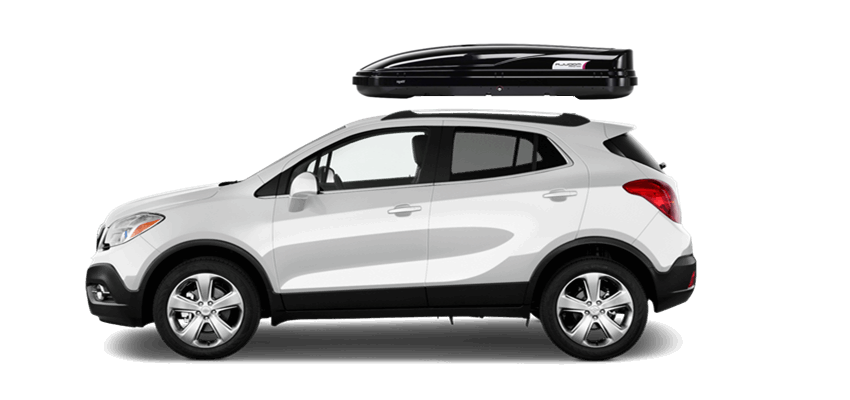 Thule Sonic Large 634B on Buick Encore Patented AeroNose Design cuts through the air and reduces drag and noise | Patented Rear-Angled Base and expanded vehicle mounting points help maximize trunk and hatch clearance | AcuTight Mounting "clicks" when you reach optimal hold to ensure your box is secured to the rack | Oversized SecureLock ensures the box is closed securely and properly prior to driving | Dual-Side Opening for loading/unloading from either side of the vehicle
