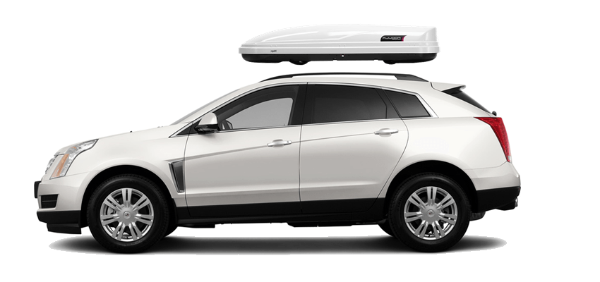 Thule Sonic Large 634S on Cadillac SRX Patented AeroNose Design cuts through the air and reduces drag and noise | Patented Rear-Angled Base and expanded vehicle mounting points help maximize trunk and hatch clearance | AcuTight Mounting "clicks" when you reach optimal hold to ensure your box is secured to the rack | Oversized SecureLock ensures the box is closed securely and properly prior to driving | Dual-Side Opening for loading/unloading from either side of the vehicle