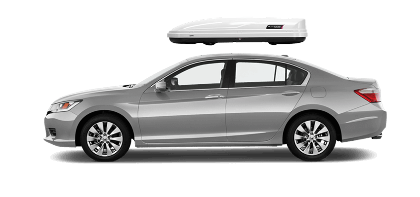 Thule Sonic Large 634S on Honda Accord Patented AeroNose Design cuts through the air and reduces drag and noise | Patented Rear-Angled Base and expanded vehicle mounting points help maximize trunk and hatch clearance | AcuTight Mounting "clicks" when you reach optimal hold to ensure your box is secured to the rack | Oversized SecureLock ensures the box is closed securely and properly prior to driving | Dual-Side Opening for loading/unloading from either side of the vehicle