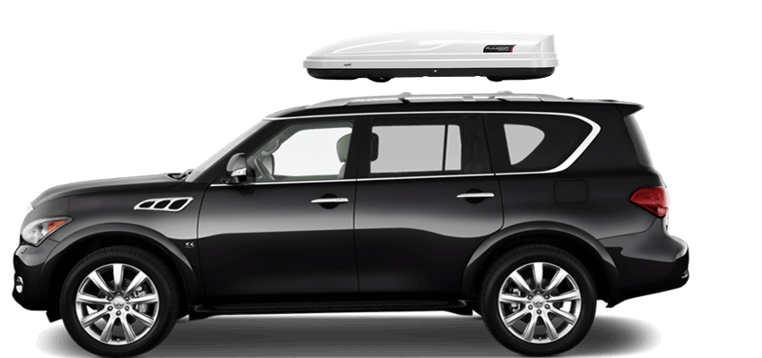 Thule Sonic XXL 636S on Infiniti QX80 Patented AeroNose Design cuts through the air and reduces drag and noise | Patented Rear-Angled Base and expanded vehicle mounting points help maximize trunk and hatch clearance | AcuTight Mounting "clicks" when you reach optimal hold to ensure your box is secured to the rack | Oversized SecureLock ensures the box is closed securely and properly prior to driving | Dual-Side Opening for loading/unloading from either side of the vehicle