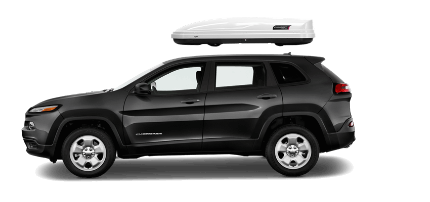 Thule Sonic XXL 636S on Jeep Cherokee Patented AeroNose Design cuts through the air and reduces drag and noise | Patented Rear-Angled Base and expanded vehicle mounting points help maximize trunk and hatch clearance | AcuTight Mounting "clicks" when you reach optimal hold to ensure your box is secured to the rack | Oversized SecureLock ensures the box is closed securely and properly prior to driving | Dual-Side Opening for loading/unloading from either side of the vehicle