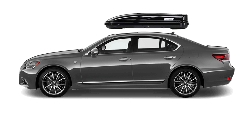 Thule Sonic XL 635S on Lexus LS Patented AeroNose Design cuts through the air and reduces drag and noise | Patented Rear-Angled Base and expanded vehicle mounting points help maximize trunk and hatch clearance | AcuTight Mounting "clicks" when you reach optimal hold to ensure your box is secured to the rack | Oversized SecureLock ensures the box is closed securely and properly prior to driving | Dual-Side Opening for loading/unloading from either side of the vehicle