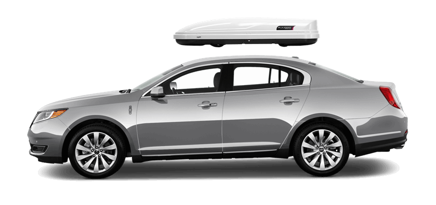 Thule Sonic Large 634S on Lincoln MKS Patented AeroNose Design cuts through the air and reduces drag and noise | Patented Rear-Angled Base and expanded vehicle mounting points help maximize trunk and hatch clearance | AcuTight Mounting "clicks" when you reach optimal hold to ensure your box is secured to the rack | Oversized SecureLock ensures the box is closed securely and properly prior to driving | Dual-Side Opening for loading/unloading from either side of the vehicle