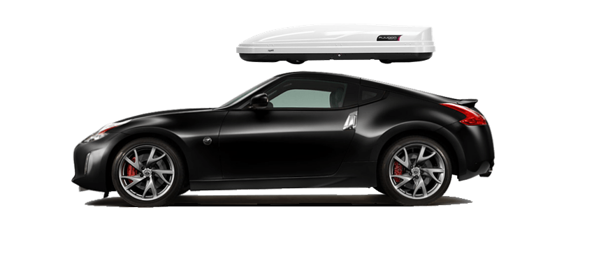 Thule Sonic Large 634S on Nissan 370Z Patented AeroNose Design cuts through the air and reduces drag and noise | Patented Rear-Angled Base and expanded vehicle mounting points help maximize trunk and hatch clearance | AcuTight Mounting "clicks" when you reach optimal hold to ensure your box is secured to the rack | Oversized SecureLock ensures the box is closed securely and properly prior to driving | Dual-Side Opening for loading/unloading from either side of the vehicle
