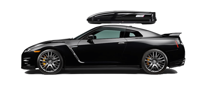 Thule Sonic XXL 636S on Nissan GT-R Patented AeroNose Design cuts through the air and reduces drag and noise | Patented Rear-Angled Base and expanded vehicle mounting points help maximize trunk and hatch clearance | AcuTight Mounting "clicks" when you reach optimal hold to ensure your box is secured to the rack | Oversized SecureLock ensures the box is closed securely and properly prior to driving | Dual-Side Opening for loading/unloading from either side of the vehicle