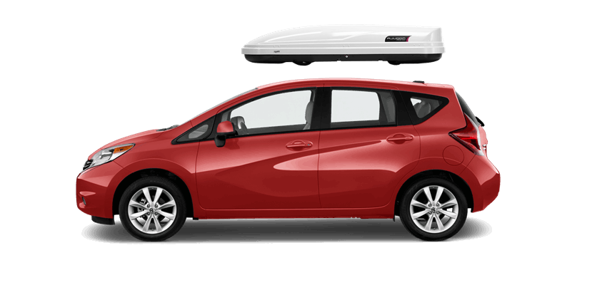 Thule Sonic XXL 636S on Nissan Versa Note Patented AeroNose Design cuts through the air and reduces drag and noise | Patented Rear-Angled Base and expanded vehicle mounting points help maximize trunk and hatch clearance | AcuTight Mounting "clicks" when you reach optimal hold to ensure your box is secured to the rack | Oversized SecureLock ensures the box is closed securely and properly prior to driving | Dual-Side Opening for loading/unloading from either side of the vehicle