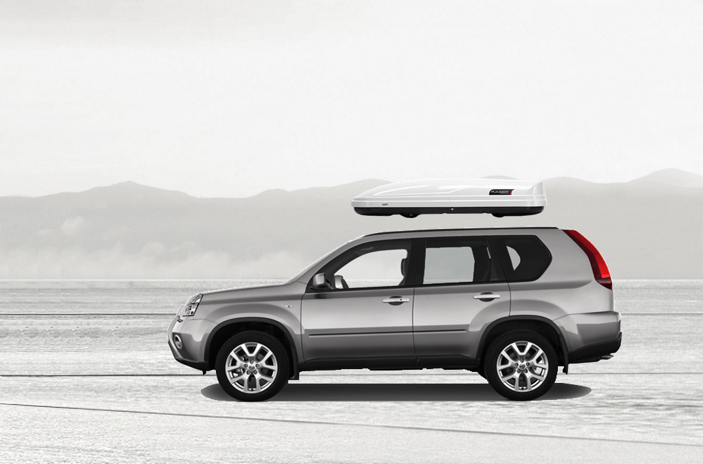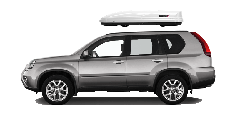 Thule Sonic XXL 636S on Nissan X-trail Patented AeroNose Design cuts through the air and reduces drag and noise | Patented Rear-Angled Base and expanded vehicle mounting points help maximize trunk and hatch clearance | AcuTight Mounting "clicks" when you reach optimal hold to ensure your box is secured to the rack | Oversized SecureLock ensures the box is closed securely and properly prior to driving | Dual-Side Opening for loading/unloading from either side of the vehicle