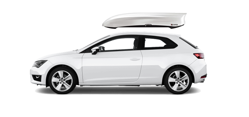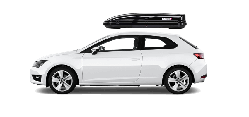 Thule Sonic XXL 636S on Seat Leon SC Patented AeroNose Design cuts through the air and reduces drag and noise | Patented Rear-Angled Base and expanded vehicle mounting points help maximize trunk and hatch clearance | AcuTight Mounting "clicks" when you reach optimal hold to ensure your box is secured to the rack | Oversized SecureLock ensures the box is closed securely and properly prior to driving | Dual-Side Opening for loading/unloading from either side of the vehicle