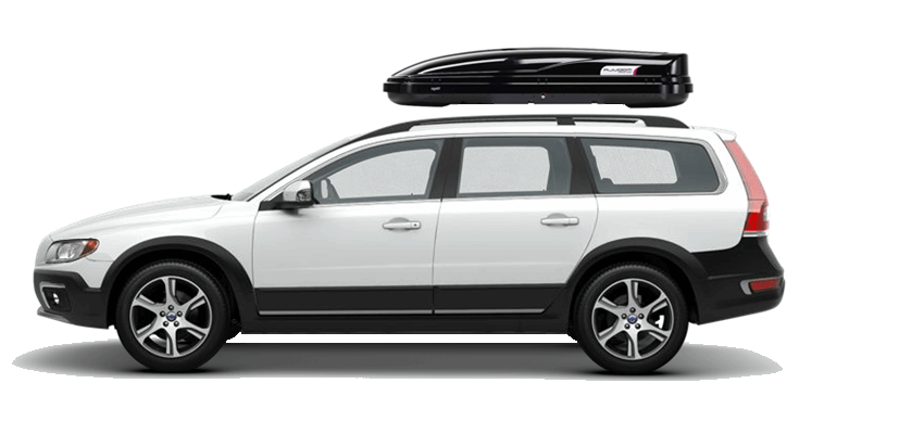 Thule Sonic XXL 636S on Volvo XC70 Patented AeroNose Design cuts through the air and reduces drag and noise | Patented Rear-Angled Base and expanded vehicle mounting points help maximize trunk and hatch clearance | AcuTight Mounting "clicks" when you reach optimal hold to ensure your box is secured to the rack | Oversized SecureLock ensures the box is closed securely and properly prior to driving | Dual-Side Opening for loading/unloading from either side of the vehicle