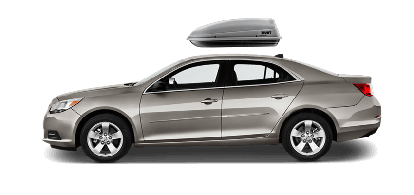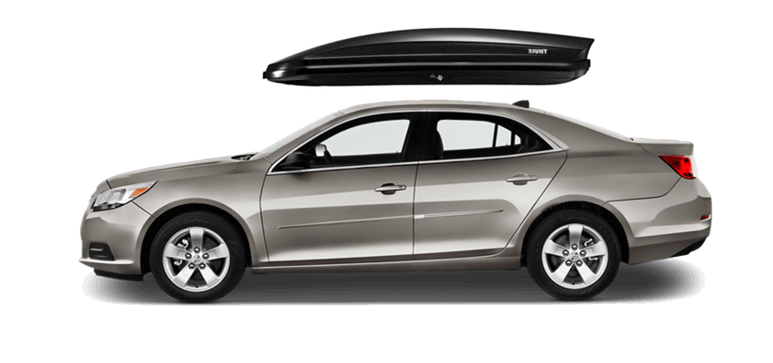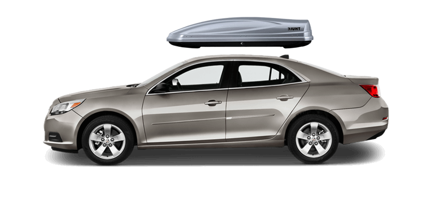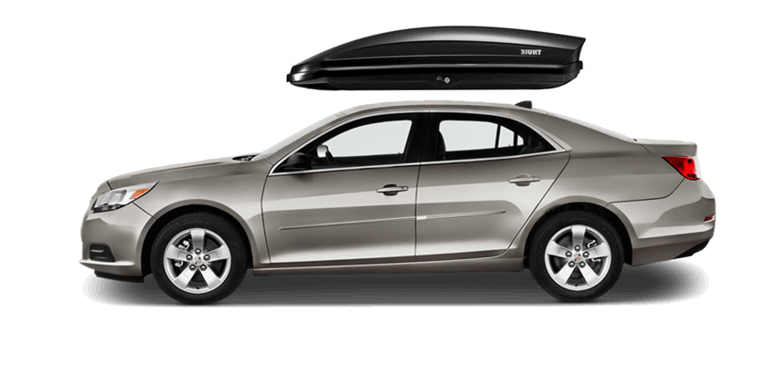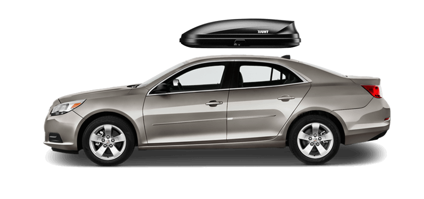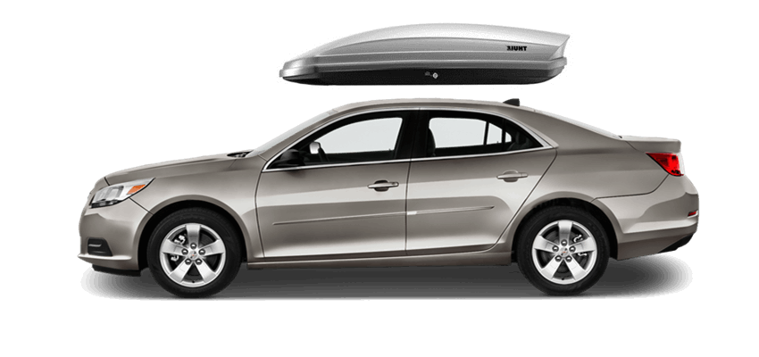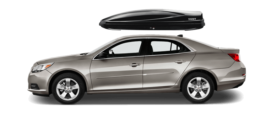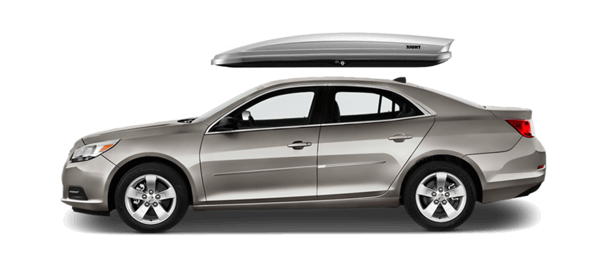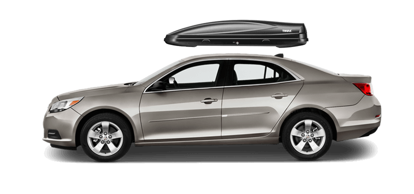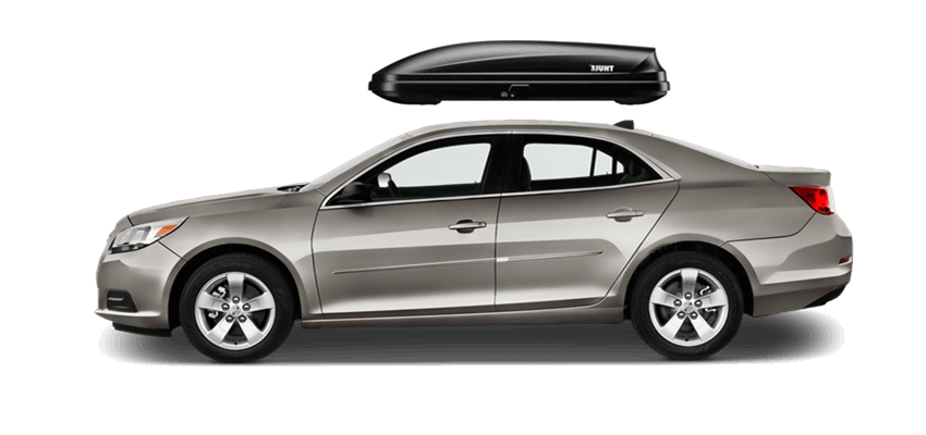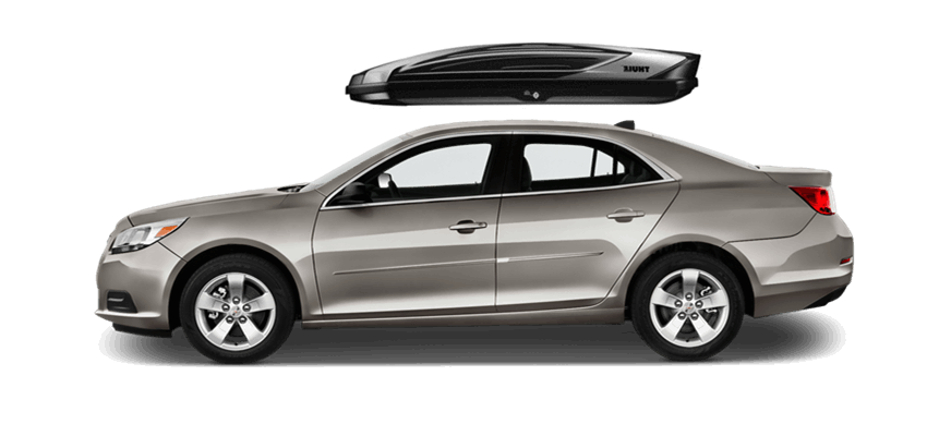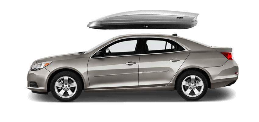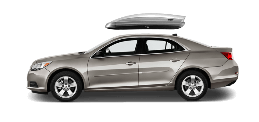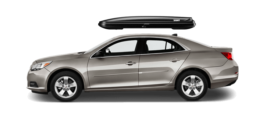 Thule Force L 624 on Chevrolet Malibu 65 x 34.5 x 16 in 13 cu Diamond-Textured Aero Skin Lid is durable and the aerodynamic shape helps cut through the air | Tool-Free Quick-Grip mounting system attaches box to rack in less than 5 minutes | Oversized Secure Lock ensures the box is closed securely | Dual-Side Opening for loading/unloading from either side of the vehicle | Fits Thule rack systems, round bars and most factory racks Thule Force L 624 on Chevrolet Malibu